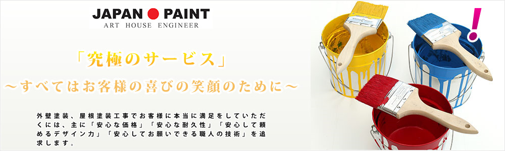 ジャパンペイントでは、外壁塗装、屋根塗装工事専門店のスペシャリストとしてプライドをもち、本当に良い商品を低コストでお勧めできるように、全力を尽くして努力させて頂きます。 >>>厳選塗料はこちらより